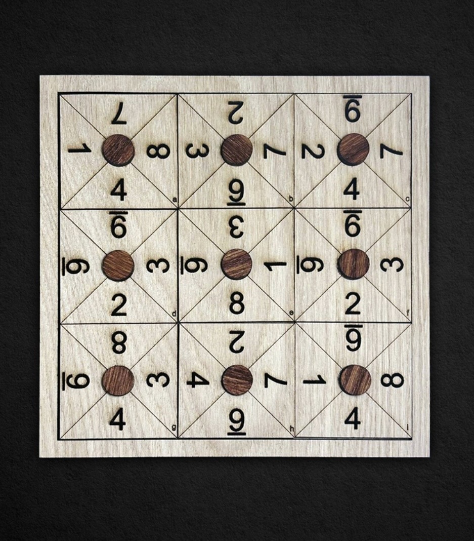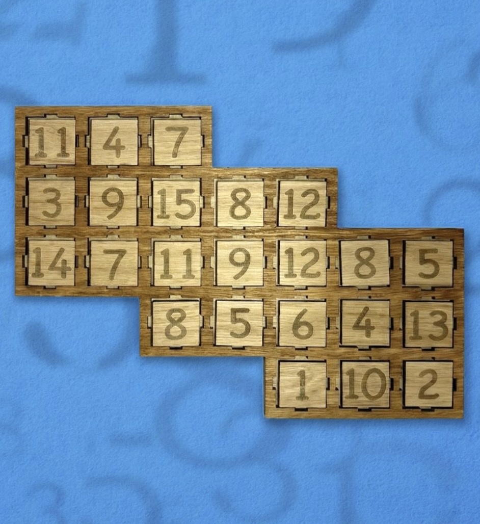 Классическая сетка 3x3 или 4x4, где нужно разместить цифры или числа так, чтобы получить заданную сумму по строкам, столбцам и диагоналям. В деревянном исполнении это часто набор пронумерованных кубиков или плашек, которые можно физически переставлять, находя верную комбинацию.